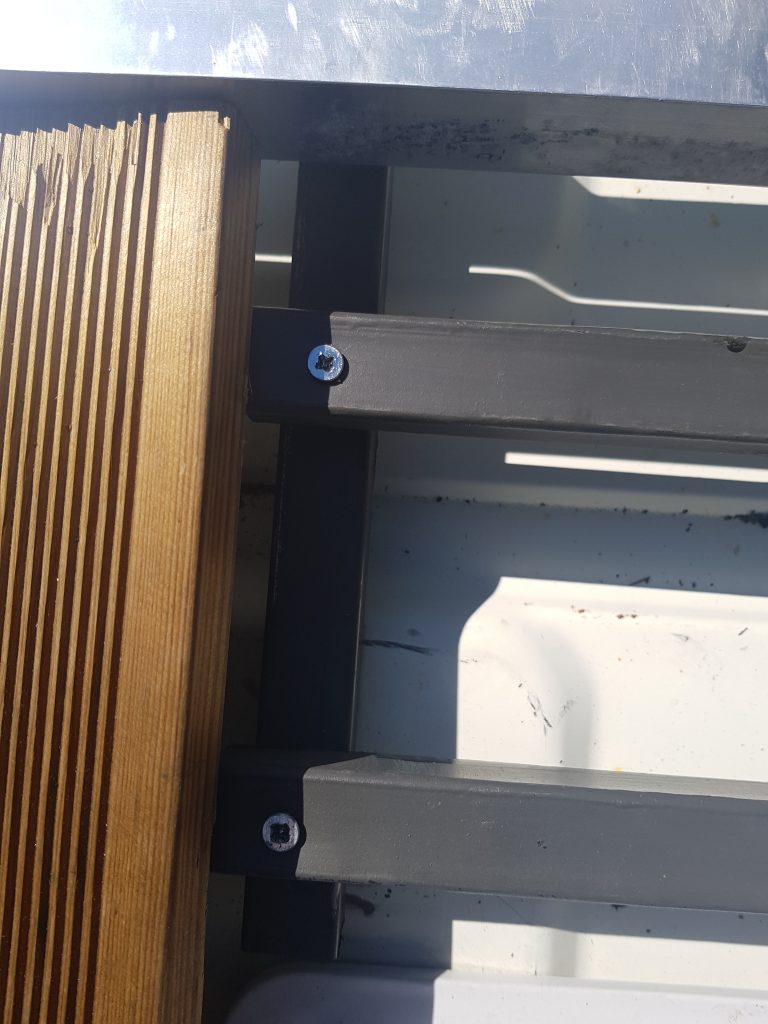 La seconde perceuse n’étant pas aussi adaptée pour pouvoir viser / percer le fer, j’ai donc pris énormément de temps pour fixer sur la galerie mes 2 petites barres de renforts, qui auront pour but d’accueillir les derniers petits bouts de lames de terrasse.