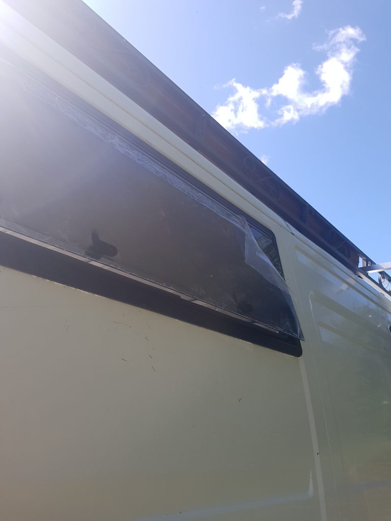 Enfin cette journée s’est terminée avec la mise en étanchéité de la grande fenêtre latérale gauche. Je voulais absolument une étanchéité et un rendu parfait, du coup j’ai pris énormément de temps à poser le Sika et à faire le joint. C’est ainsi que le jour s’est couché me laissant tout juste le temps de terminer les finitions du joint.