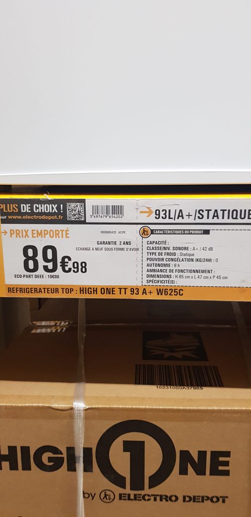 Chez électro-dépôt je me suis trouvé un super petit frigo aux dimensions parfaites, pas très profond, moins de 50cm, avec une bonne contenance, et une super consommation inférieure à celle de bien des glacières ou frigo 12v ! Le tout pour moins de 100 euros ! Alors clairement, ça sent le super bon plan, quand on sait que pour avoir une glacière ou frigo “campingcar” il faut plus débourser dans les 300 à 500 euros …