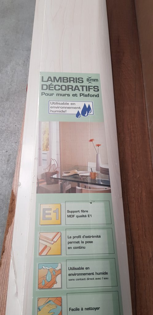 Ensuite, j’avais repérées des lames de parquet PVC/mélaminée chez brico-dépôt, on est donc passé les prendre, et au passage, on est tombé sur du lambris bois blanc bien comme je le désire 😀